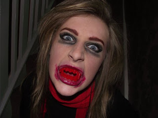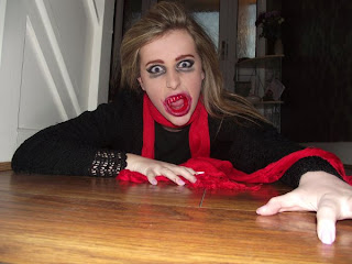 Below is the original image I had taken of the actress lying down on wooden floor, I didn’t necessarily want either the background or the floor to be part of the picture. Although I found the angle of the shot to be interesting and different, she has both her hands gripped to the floor as though she is desperate in need of something, in this case human blood. The expression on her face implies that she is frustrated and almost in pain because she needs the fix of blood so badly. As she her eyes peer into the camera it makes the audience feel tense and uneasy as they imagine her popping out of the page, the vampire is ready and rearing to pounce on her victim whom the viewer believes is them.
